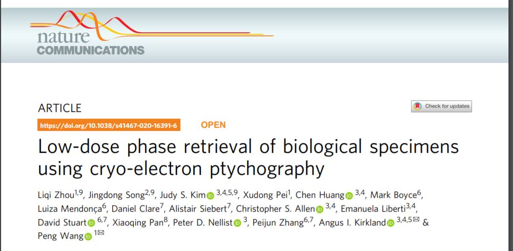 近日,现代工学院王鹏教授课题组联合中国疾病预防控制中心宋敬东研究员以及英国牛津大学材料系Angus Kirkland教授课题组,率先实现低电子剂量条件下生物样品的高衬度冷冻电子叠层衍射计算机重构成像(Cryo-Ptychography)技术。该研究成果以"Low-Dose Phase Retrieval of Biological Specimens using Cryo-Electron Ptychography"为题,于2020年6月2日在Nature Communications上发表(DOI:10.1038/s41467-020-16391-6)。