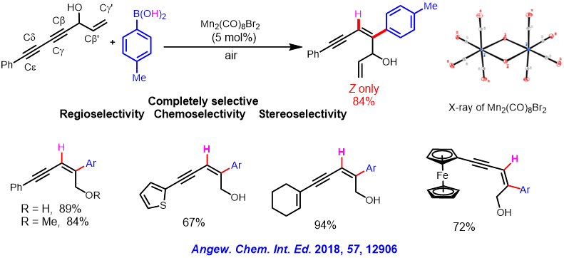 2018年,谢劲课题组通过双核锰催化实现了非对称共轭二炔的选择性芳基化反应,该反应也是第一例锰催化芳基硼酸的转金属化反应并应用于共轭双炔高选择性迁移插入的过程(Angew. Chem. Int. Ed. 2018, 57, 12906)。反应在兼具优异的区域、化学和立体选择性之时,还具有非常好的官能团兼容性与普适性,为共轭烯炔的高效合成提供了新方法。著名金属有机化学家Vollhardt, K. Peter邀请在Synlett上以Synfacts文章类型进行亮点介绍。