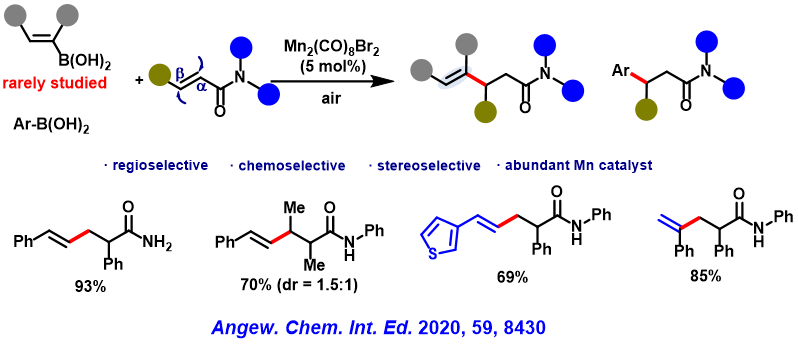 芳基硼酸具有特异的反应活性、稳定性、易得性、易操作性,是一类非常重要并有着广泛合成应用的芳基源。由于非螯合的多羰基芳基锰化合物活性非常高,容易发生分子内的迁移重排反应;而高价锰催化剂容易与芳基硼酸发生单电子氧化形成相应的芳基自由基。为此, 锰催化的芳基硼酸在有机合成中的应用仍然是锰催化领域的一大挑战。凯发k8官网化学化工学院谢劲课题组独辟蹊径,利用桥联的三中心四电子双核锰提高催化活性,实现了有机硼酸的高效转金属化,并成功应用于不饱和化学键的可控迁移插入过程,为研究金属锰参与的基元反应提供了新例证(Angew. Chem. Int. Ed.2018, 57, 12906;Angew. Chem. Int. Ed.2020, 59, 8430;Angew. Chem. Int. Ed. 2020, 59, 12789;Chin. J. Chem.2020, 10.1002/CJOC.202000376)。博士研究生燕中飞、王东平、庞玉博分别为系列工作的第一作者。相关论文发表后,得到了国内外同行的关注,在Synfacts、Synlett和《有机化学》上进行亮点介绍。