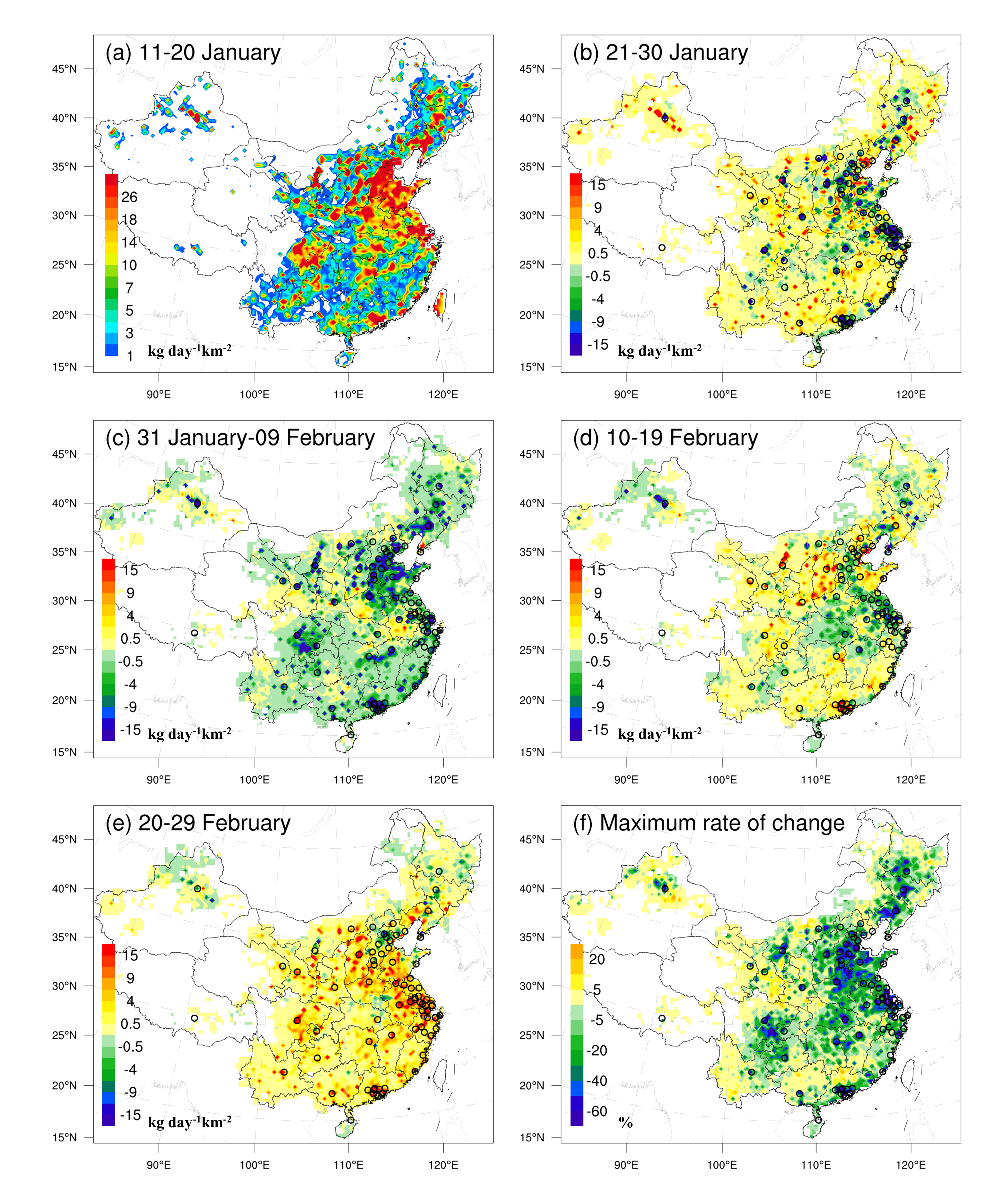 图2. 全国每10天平均的NOx排放变化(a,11-20日的全国NOx排放量;b-e,相对之前10天的排放变化;f,相比疫情之前NOx排放的最大降幅)