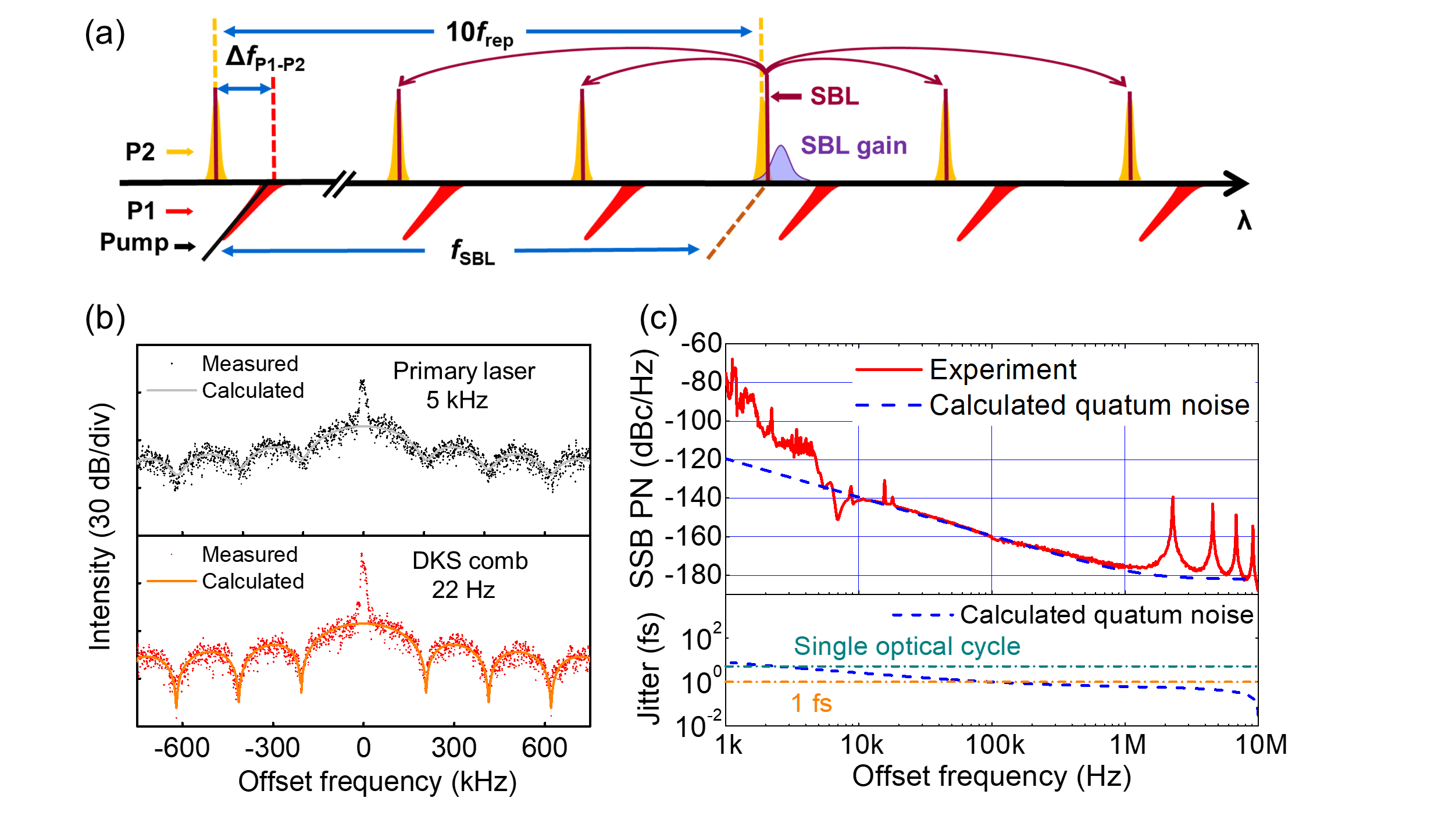 针对上述问题,凯发k8官网和科罗拉多大学团队采用机械抛光和光学镀膜的方法,制备了具有高品质因子(Q)的法布里珀罗光纤微腔,Q值可达3.4 × 107。研究人员创造性地提出了“两步泵浦”的新机制(由图1所示),即利用光纤微腔内腔增强的交叉偏振受激布里渊激光(SBL)间接泵浦产生光孤子光频梳。通过两步泵浦,该光频梳的噪声可以突破泵浦激光的噪声限制,通过外力可调的应力致双折射可以调控孤子状态并实现热稳定孤子产生,因而该光梳可以逼近光纤微腔本身较低的量子噪声极限。自由运转状态下的微腔光频梳噪声水平已接近飞秒锁模激光器,时间抖动可以低于一个光学周期,达到了“光子飞轮”级别。
