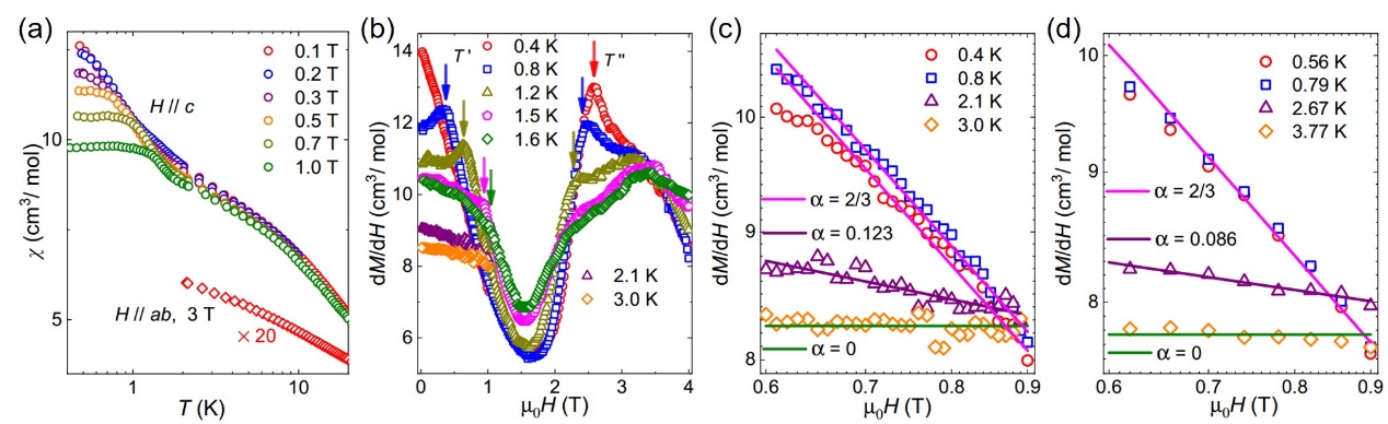 为了进一步确认NMR得到的结论,实验团队对TmMgGaO4单晶样品进行了极低温的磁化率测试,其结果如图 2所示。如图2(a)所示,在磁场平行于c轴时,磁化率在1 K随磁场增加而减小,表明了在此温度以下磁性关联的建立。图2(b)展示了微分磁化率dM/dH随磁场的演化,从中可以看出0.8 K至1.6 K的曲线各有两个相变温度。基于三角晶格伊辛模型的场论分析指出,给样品施加一个较弱的面外磁场时,微分磁化率在趋近于BKT相时应当表现出不同的幂指数函数行为,即dM/dH ~ H-α。理论预测,当温度处于在BKT相的下边界附近时,由于系统的六重对称性破缺,α的值应为2/3,当温度增加时,其值逐渐减小。当温度到BKT相的上边界以下的某一中间温度时,α的值为0。这一理论预测也得到了实验的验证,进一步证实了在0.9 K 至1.9 K温区内,系统处于BKT相。具体的实验数据和理论分析的结果如图 2 (c)和 (d)所示。