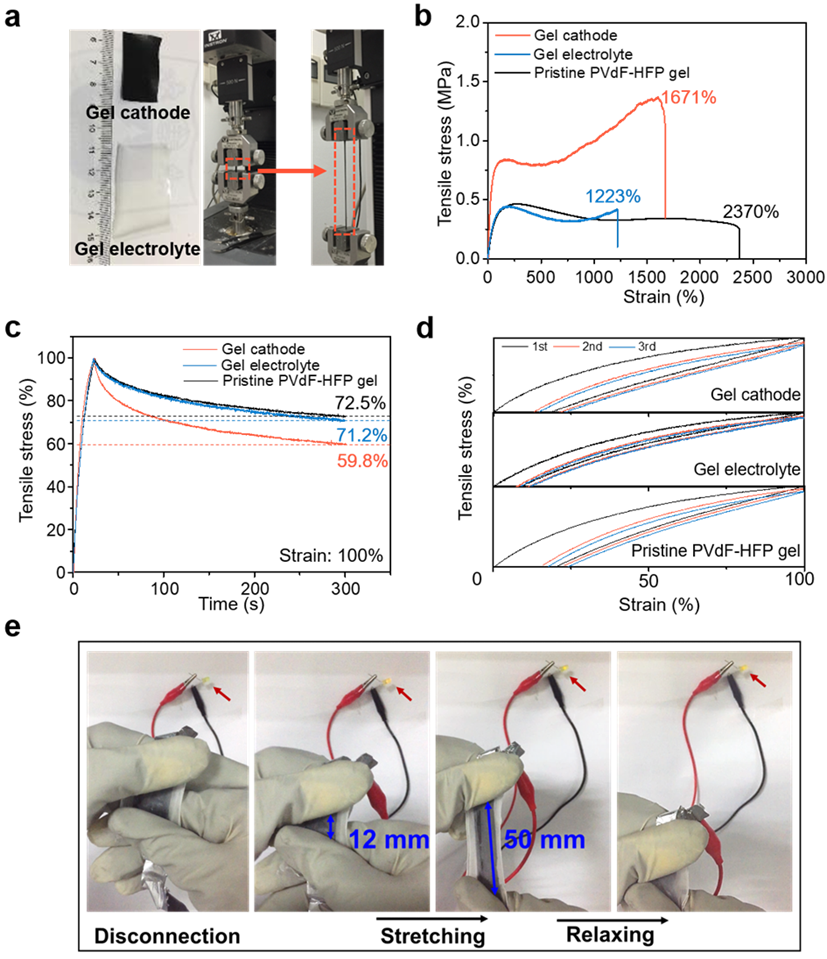 图2. 柔性可拉伸凝胶电极、电解质和柔性锂硫电池的力学性能测试。