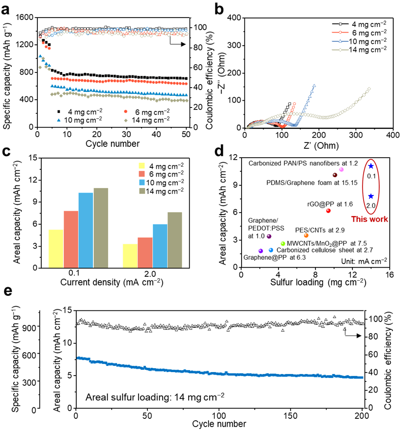 图4. 柔性可拉伸锂硫电池在高面积载硫量下的性能对比测试。