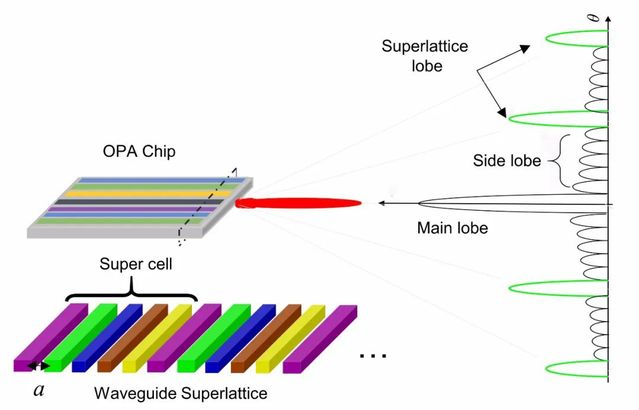 此工作发展了基于波导超晶格的光学相控阵的基本理论,阐明了波导超晶格的非均匀性带来的主要影响表现为由超晶格结构诱导出的一类次光束(可称为"超晶格瓣");并给出了抑制此类次光束的方案。为保证光学相控阵的工作,需要抑制不同波导间的模式耦合(即信号串扰)。波导超晶格将不同宽度的波导组成超元胞,从而使不同波导中模式的传播常数产生差异,以此抑制波导间的模式耦合。此前该组的研究已经给出抑制串扰的理论。此次工作中的基于波导超晶格的光学相控阵理论表明:为抑制"超晶格瓣"这种次光束,原则上波导超晶格的非均匀性应当尽可能小。而抑制串扰要求不同波导的模式传播常数有较大差异,即波导超晶格的非均匀性应当足够大。两种需求之间产生了矛盾。针对此问题,该课题组发现超元胞内光的横向相干性可用来调控光束特性;且当超元胞较大时,可提供足够多的光调控自由度来抑制"超晶格瓣",进而发现了均衡抑制次光束与波导间串扰的理论依据。最终找到了一种波导超晶格结构(SC5b)可使相应的光学相控阵性能比较接近理想的半波长阵元间距的均匀光学相控阵的性能。
