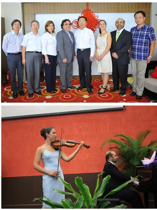 下午,灵魂颂歌——中智友好音乐会在我院思源报告厅举行,副院长邵进、西班牙语系主任陈凯先等与300余名师生一起欣赏了精彩演出。作为我院“高雅艺术进校园”系列活动之一,本次音乐会特别邀请智利著名钢琴家Alexandros Jusakos先生和小提琴家Yvanka Milosevic Lira女士联袂演出,六首曲目美妙悦耳,经典乐章震撼人心。音乐会的高潮来自两位演奏家的合奏:一曲节选改编自歌剧“浮士德”的小提琴、钢琴协奏曲,二者的完美交融令台下观众产生极大共鸣,纷纷报以热烈的掌声。