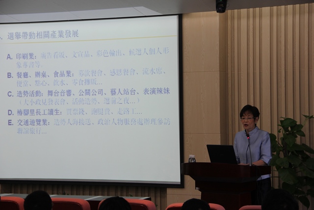 赵雅丽博士还站在传播学角度分析了台湾选举中的主要传播情境与策略。她认为选举过程中主要的情境非常明显,包括组织传播、人际传播、意见领袖的二次传播以及大众传播。这些传播情境通过各种媒介途径让普通民众,意见领袖,企业家,学者等不同群体参与到台湾的选战当中,表达自己的心声,传递自己的影响,左右着选战的最终结果;而具体的选举策略则有刺客策略(寻找拥有高知名度地人士参选)、政党差异(明确出不同政党的政治立场)、文宣策略(在宣传过程中应用竞选战术左右选举)、广告定律等四种。讲座中,赵雅丽博士举出了很多台湾地方选举中的宣传案例、经典时刻、著名人物,给在场的同学们提供了更为具体和直观的台湾政治选举图景。