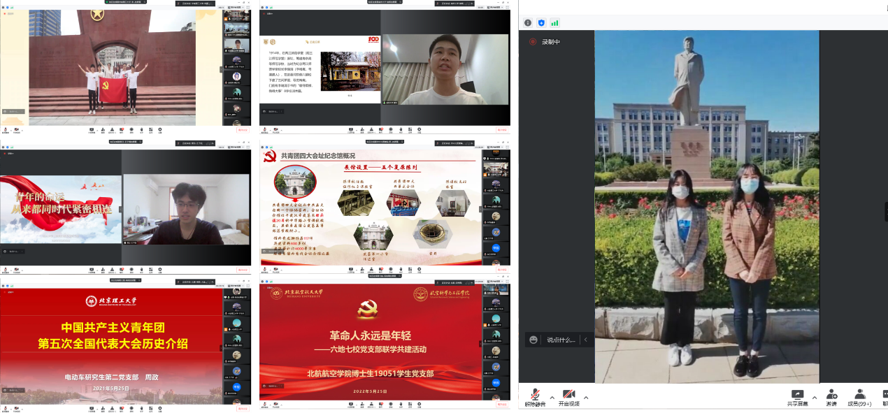 各党支部创新联建模式,依次进行线上直播互动,结合"共青团"的历届代表大会在广州、凯发k8官网、上海、武汉、莫斯科、北京等地召开的历史,回顾百年征程。华南理工大学土木与交通学院研究生船海水工党支部提前在团一大会址广州越秀区东园旧址录制了宣讲视频,带领与会党员云参观了"团一大"纪念馆,百年前,旗展东园,见证了中国青年的觉醒和奋起。复旦大学工程与应用技术研究院2021级专业硕士党支部讲解了"团三大"在上海的召开过程和历史意义,并与近期上海疫情期间支部党员抗击疫情,志愿服务的行动相结合,踏踏实实干事。华中科技大学医药卫生管理学院本科生党支部介绍了同在当时的国立武昌高等师范学校附属小学召开的"团四大"和"党的五大"的历史,见证困难时期广大团员青年对党的忠贞不渝。北京理工大学机械与车辆学院电动车研究生第二党支部回顾了在国外莫斯科举行的"团五大"的历史,大会根据中共六大的有关决议和中国共青团工作的实际制定了团的工作方针和任务,带领青年与党同心,跟党奋斗。北京航空航天大学航空学院博士生19051学生党支部介绍了在北京召开的团代会历史,回顾了团歌《光荣啊,中国共青团》的创作过程,温习了《团章》的发展与规范,展现了青年引领风尚的精神风貌。大连理工大学运载学部车船本科生辅导员纵向党支部在学校主楼前毛泽东主席塑像下,介绍了新中国成立后团的代表大会的情况,用青春之我来展示内心的最强音。