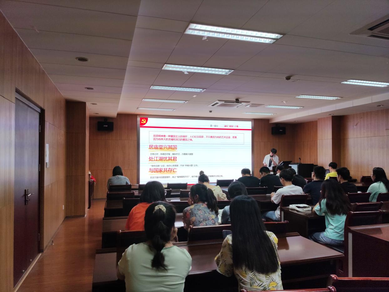 本次活动分为理论和实践教育两部分。理论教育环节,2021级硕士生二支部的彭勃以"扬爱国之情、立强国之志、践报国之行"为主题做端午爱国主义精神宣讲。他介绍了端午节的由来,以流传最广的是纪念屈原说展开,深入阐释了屈原精神在历史不断流传中通过各种形式所积淀的核心内涵——爱国主义。在"举世皆浊我独清,众人皆醉我独醒""长太息以掩涕兮、哀民生之多艰"等诗词中,映射着屈原终其一生为楚国人民福祉奔走的身影。彭勃结合总书记重要回信的精神,呼吁我们作为新时代的青年学子,要牢记习近平总书记的嘱托,肩负历史使命,勇担时代责任,坚定理想信念,讲好中国故事。
