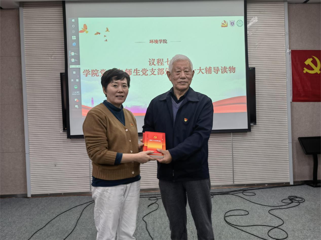 活动最后,刘建萍代表学院党委向师生党支部书记颁发二十大辅导读物。