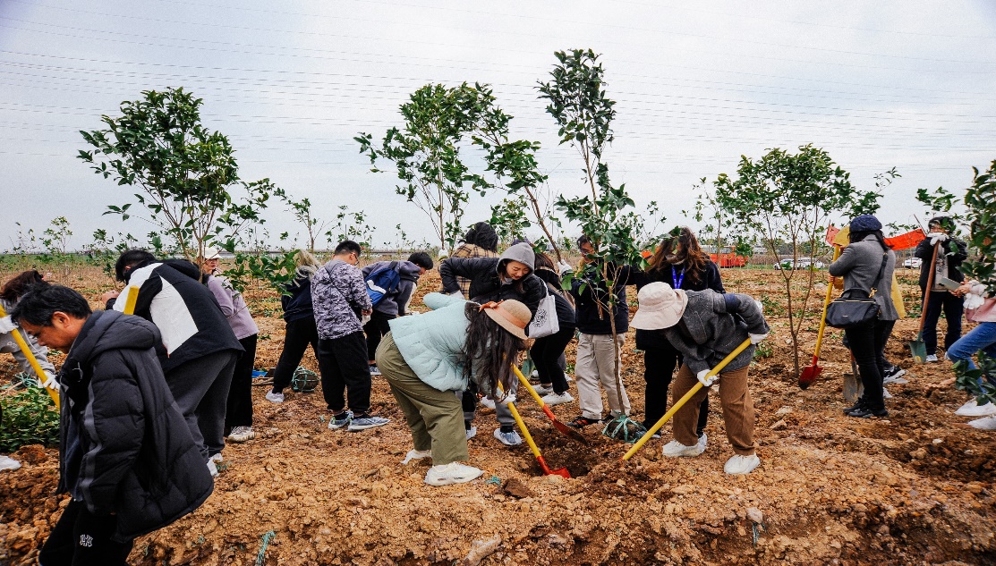 在植树活动中,师生们相互配合,分工协作,一起挥锹挖坑、扶苗栽种、培土压实、浇水灌溉,在热火朝天的氛围里延展出一片绿色生机。经过辛勤劳动,师生们共同种下的两行青绿在田野上迎风而立,展现出蓬勃的活力。