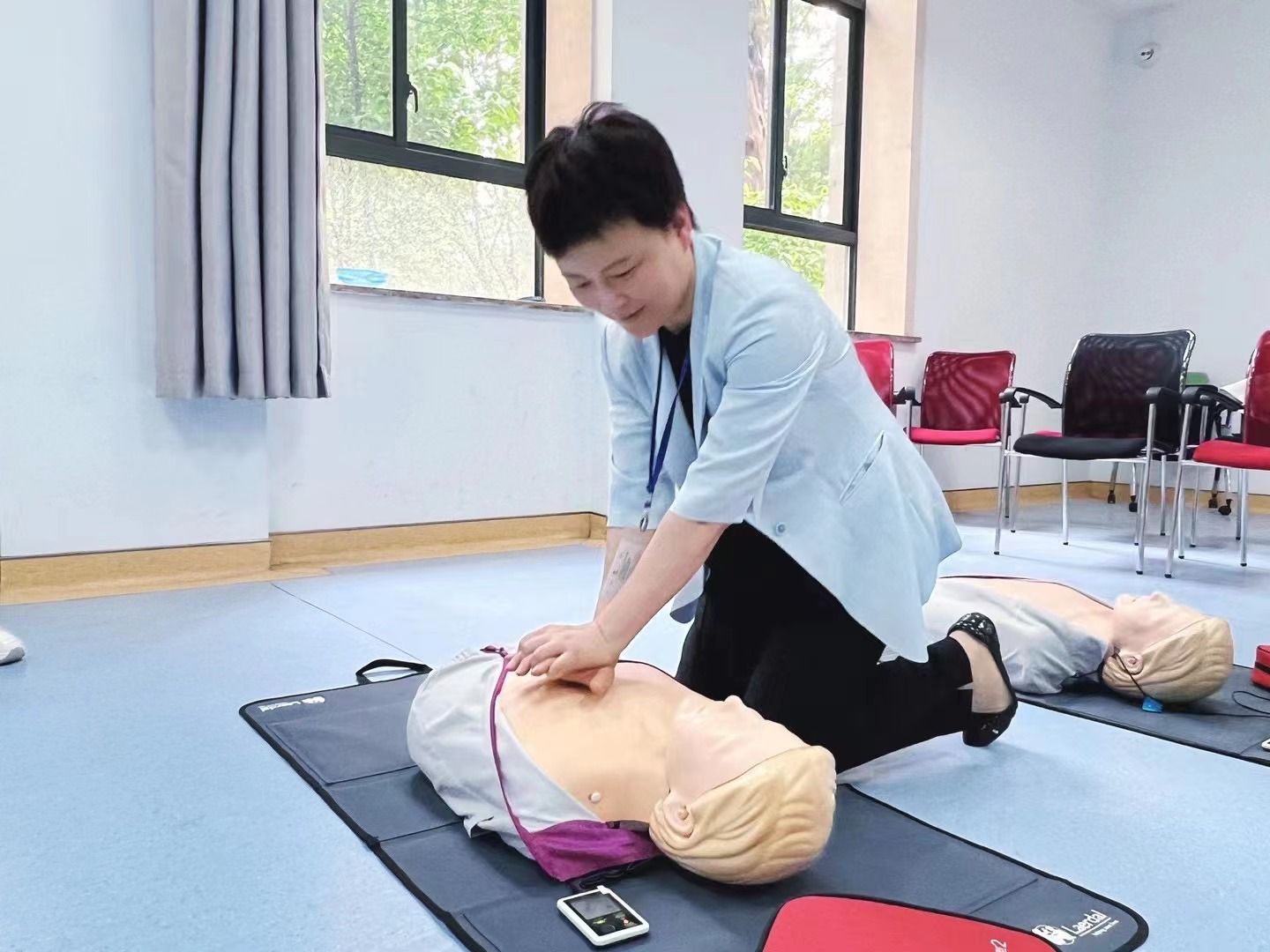 比如,考虑到心脏骤停的最佳抢救时间虽短,但却有"黄金4分钟"与生命赛跑的机会。活动中,肖瑞和徐国梅两位老师为在场的中心师生们详细讲解如何正确使用AED设备,以及为病人争取黄金救援时间的必要性和有效方法。