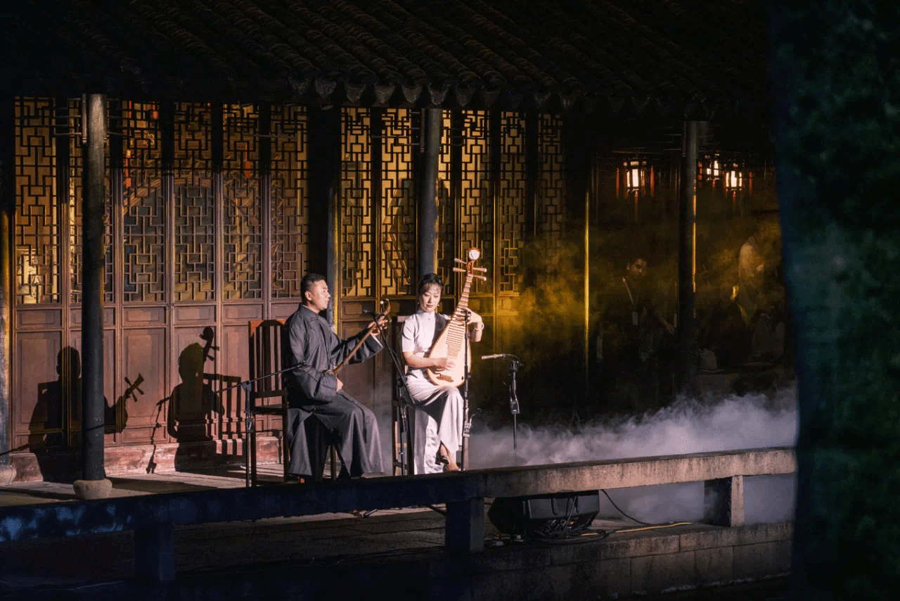 当日晚19:30,“青春时光”青年艺术家展演在同里退思园拉开帷幕。青年艺术家们于建筑、文学、戏剧、书画、哲学、山水自然间,共赴一场如梦如幻的视听盛宴。精妙的舞美让观众沉浸式地感受江南文化的魅力,传统与现代、戏曲与建筑的融合,以青春为题,刻画江南园林新的“灯火阑珊”。青年艺术家作品展演以音乐、舞蹈、戏曲等形式给予了动态的沉浸式体验,呈现出江苏省青年艺术家们在新时代融合新创意的创造潜力。