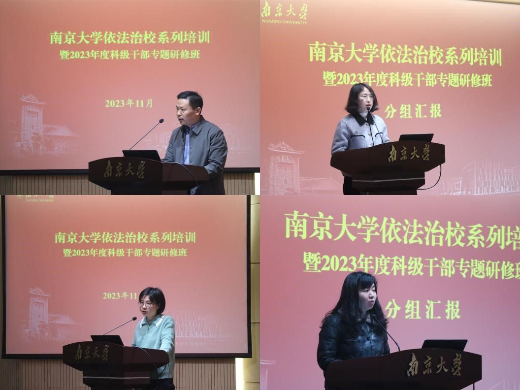 11月25日下午,科级干部专题研修班全体学员围绕“高校依法治校和治理体系治理能力现代化工作”这一主题及培训收获,分为四个小组进行讨论。本科生院李灿、校工会陈颖、物理学院王玉婷以及生命科学学院刘璟洁分别代表各小组进行发言。